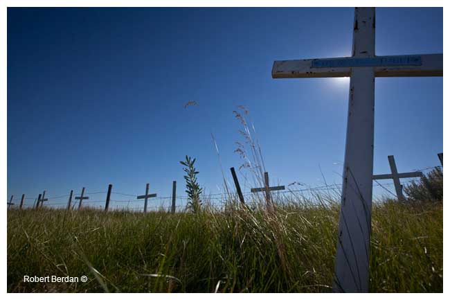 Finally we headed north on paved highway 889 to Manyberries, but the town was still sleeping when we arrived around 9:00 am. We didn’t see a single person and all we wanted was to buy a cup of coffee. We made our way north to Red Rock coulee on highway 887. Red Rock Coulee is about 20 Km south of Seven Parsons where the road does an S shaped bend. Red Rock Coulee is a natural area and is not marked on most road maps. There is however a sign on the highway that now points out this natural area. Just before turning into Red Rock coulee we stopped at an old haunted church building whose walls are starting to cave in. Behind the church was a small graveyard with about a dozen small white crosses marking the graves. I don’t normally photograph graves, but something drew me over. As I bent down to take a photograph I could feel something tugging at my legs, was it the dead reaching for me? Ok I am exaggerating, but the graves did make me think about those haunted movies and there was an erry sound of flies buzzing.