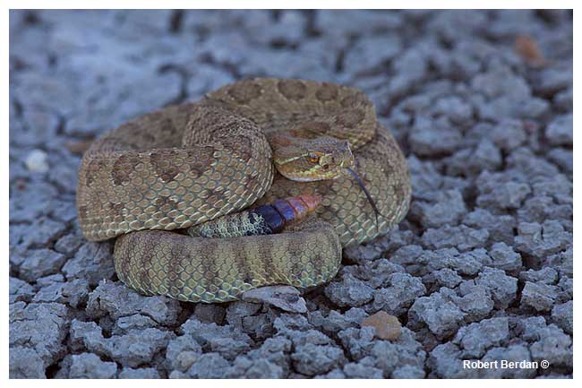 Prairie Rattlesnake photographed at Red Rock Coulee - used a 300 mm F4 lens and then a 100 mm Macro lens. The rattle snake is resting on Bentonite - mixture of clay and volcanic ash. The snake never struck out at us or acted aggressively.