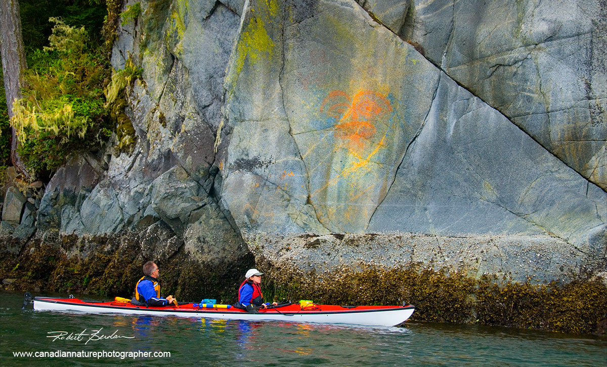 Anton and Sarina in Kayak in front of Aboriginal artwork on rock wall off the coast of British Columbia.