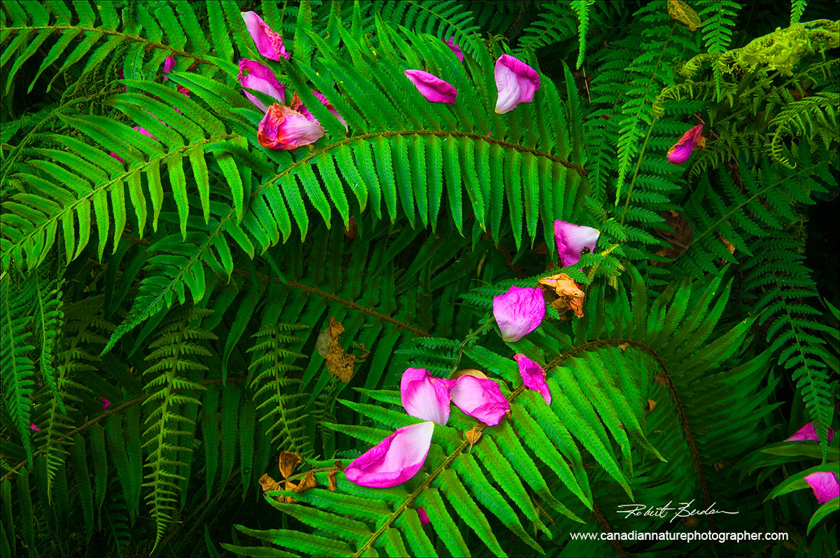 Ferns and rose petals, Bamfield, Vancouver Island.