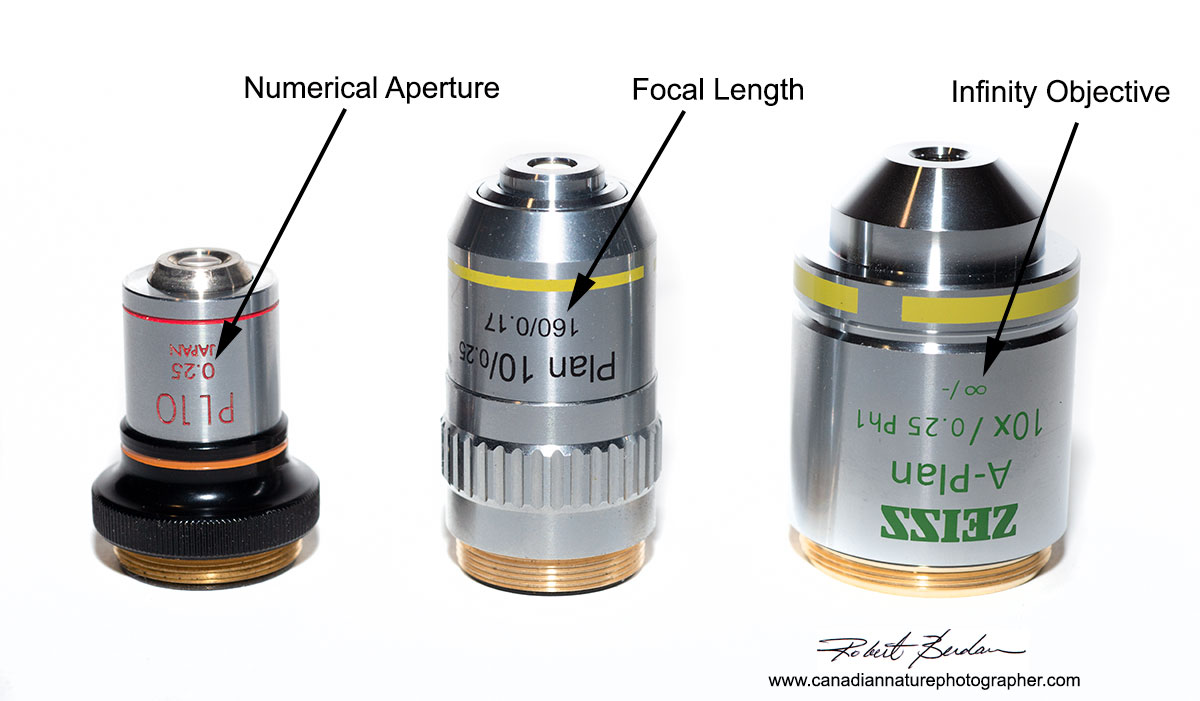 The next best objectives are called Plan Fluorite (Semi-apochromats) which are flat field corrected and more highly corrected for colour and photomicrography - they are also more expensive. The third type of objectives are Apochromats which are flat field, highly corrected for colour photography and are very expensive. The cost of a Plan Achromat is about 2X that of Achromat, a fluorite objective is about 5X the cost of an Achromat and an Apochromat can be 10X or more the cost of an equivalent Achromat objective. Achromats are fine to get started with, but if you can afford Plan Achromats they might be all you will ever need for photography. To learn more about objectives start with this article and if you want to know more about color rings on the objectives, working distance, and other features see Davidson and Abramowitz - free PDF on Zeiss Web site.