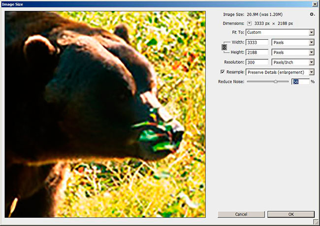 To access the image resize box you select Image > Image size as in previous versions. Using preserve details is supposed to provide the best results. What is different is the preview window is scalable and the algorithms used to up-size the image are better. Above I used a small 1.2 MB image and tried to up-size it to a 21 MB file and you can see in the preview window it still looks soft and fuzzy. The larger your initial image is the better the results and the more you can up-size, but there is a limit. In the past to make really big images I used a plug in called Genuine Fractals now called Picture Prefect Resize (web site: http://www.ononesoftware.com/products/resize8/).