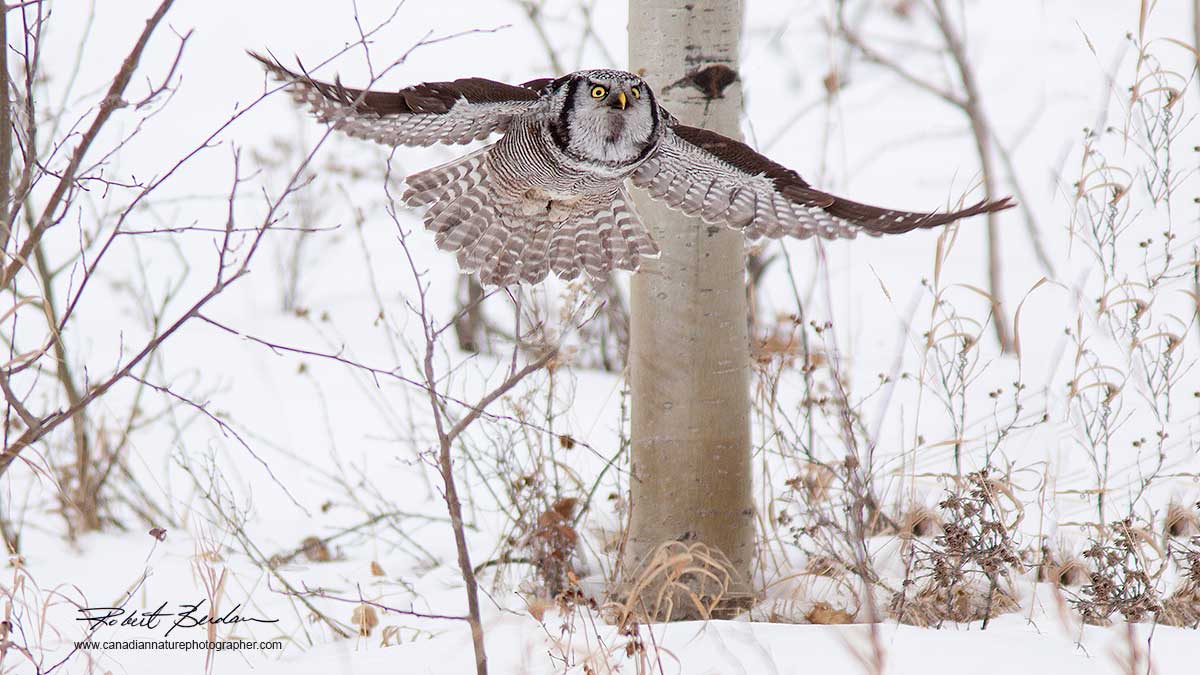 Northern Hawk Owl hunting - photographed from my car window with a 70-200 mm F2.8 lens (DM).