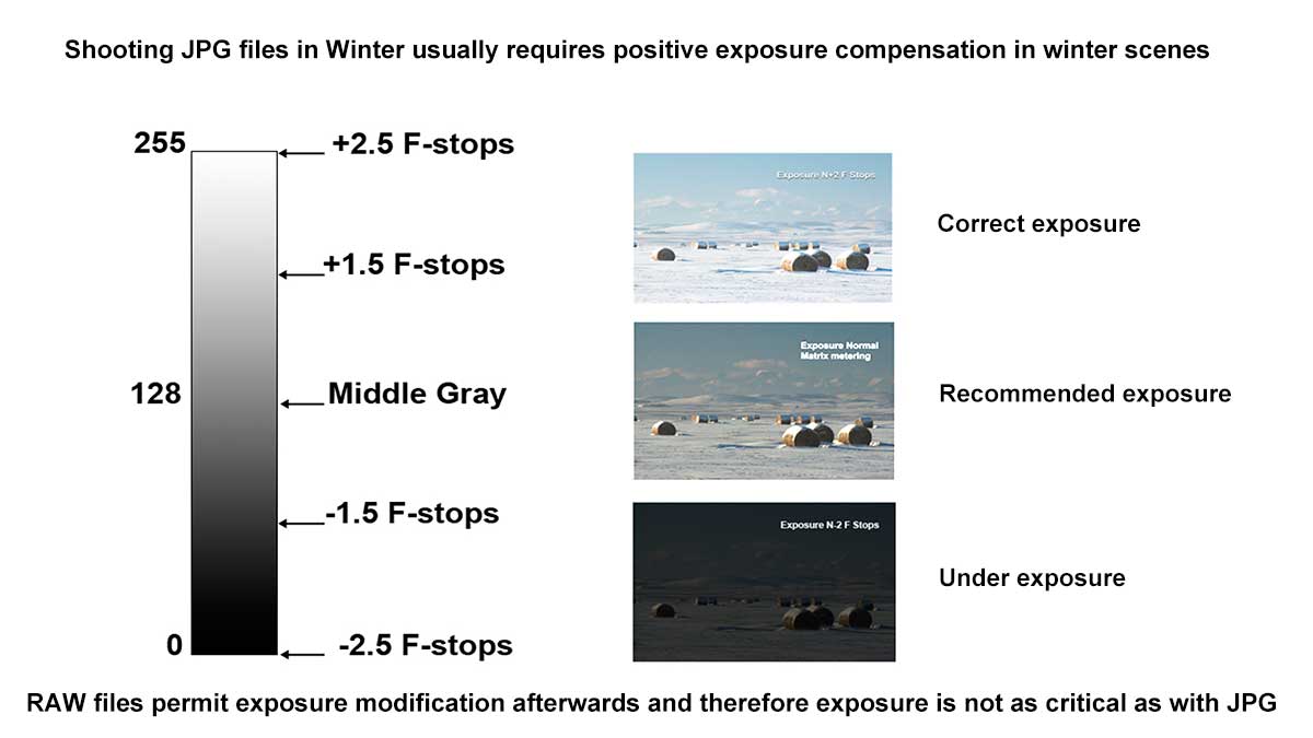 Winter around Calgary starts about the end of October and persists until about mid March though it can snow well into May. Winter lasts longer in the mountain parks. Winter landscapes are austere, but the bare trees and snow can make spotting birds and wildlife easier. In the past when I photographed scenes with snow using slide film I would increase my exposure by 1-2 F stops over the suggested meter reading so the snow was white not gray. If you shoot .jpg files it’s still recommended to over expose the scene about 1 to 1.5 F stops to expose snow properly. If shooting RAW files I often just adjust exposure afterwards in processing - so getting the right exposure is not as critical. If you look at the back of your LCD (liquid crystal display) you will see if the picture looks dark and grey and if so use your exposure compensation and dial in + 1 or more exposure and test again. See figure below to see how exposure compensation and can change the appearance of a winter scene.